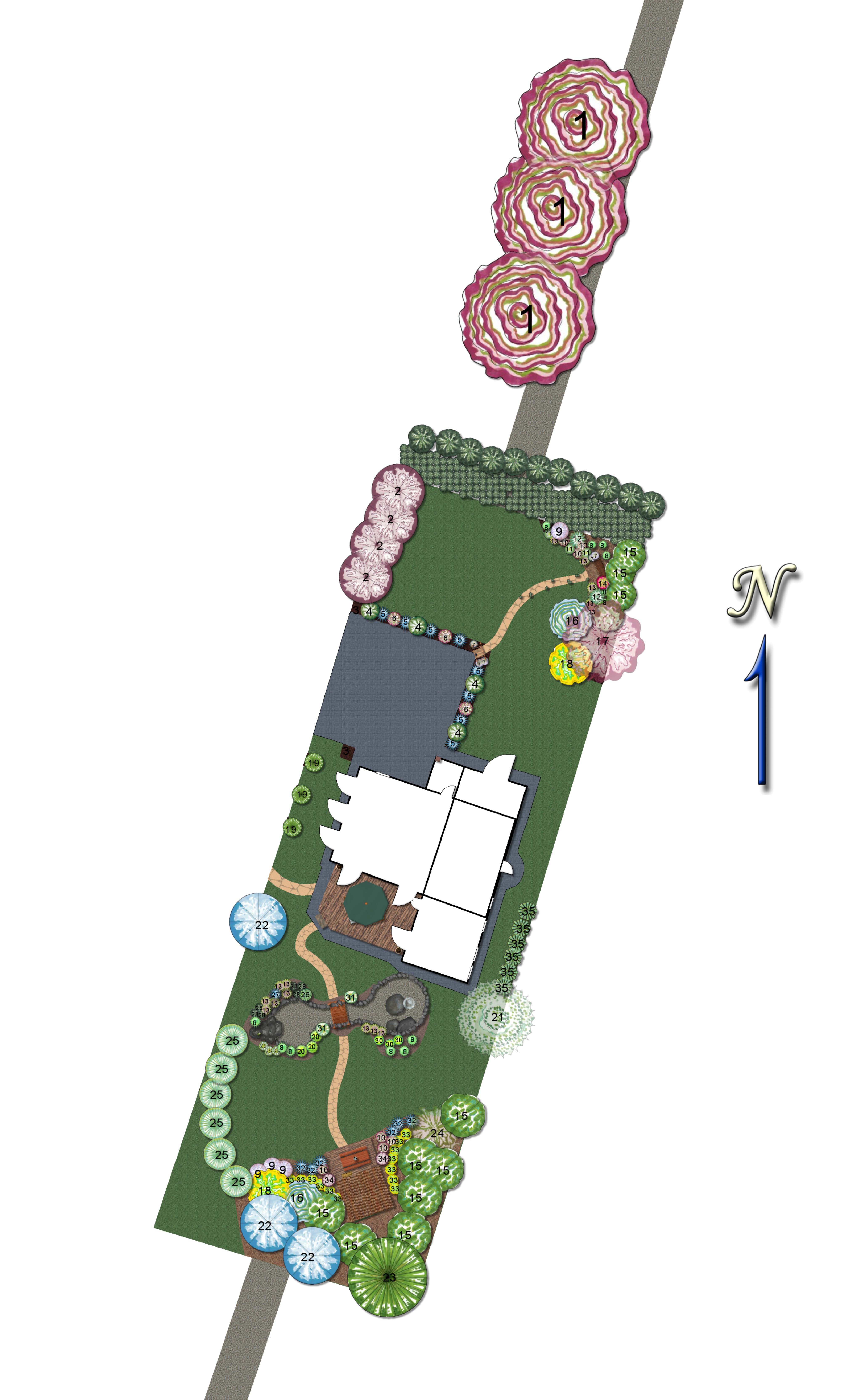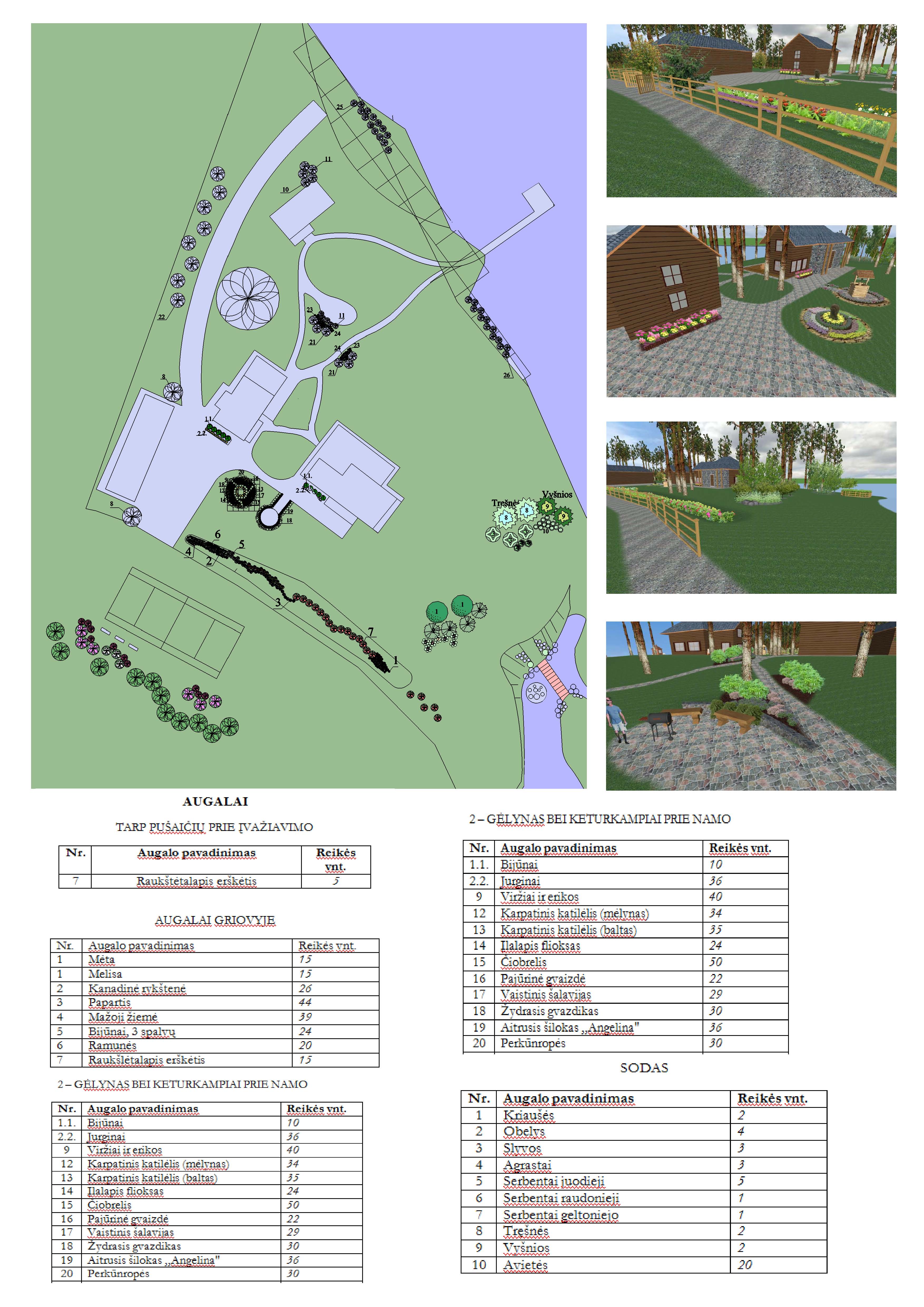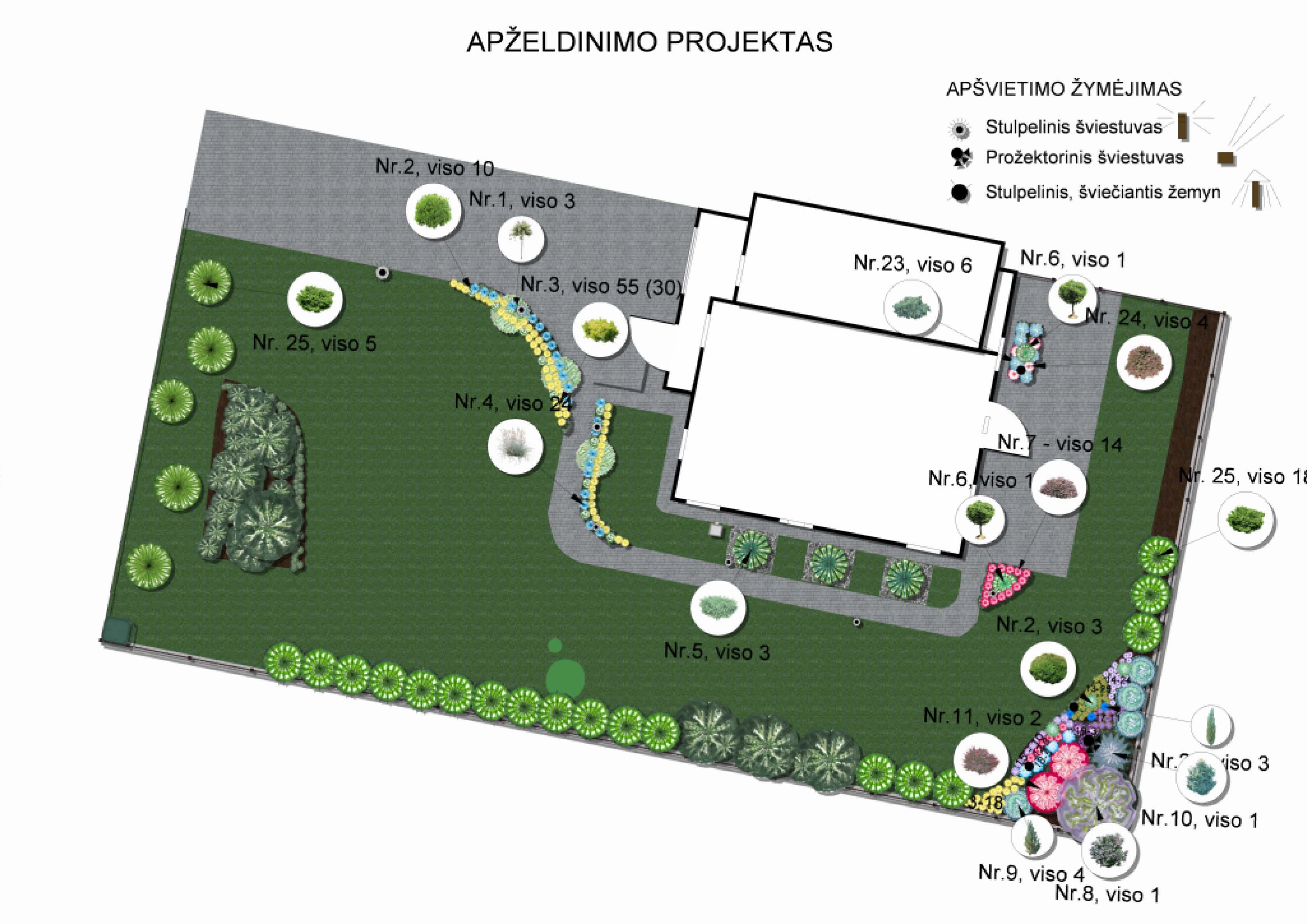 Tai svarbi apželdinimo dalis. Dizainerės darbas yra suprojektuoti aplinką taip, kad būtų funkcionalios atskiros zonos, atitinkančios žmogaus poreikius, parinkti derinčius augalus, kuriems tiktų esamos bioekologinės sąlygos. Labiausiai darbą apsunkinta tai, kad dirbama su nuolatos kintančia gyva medžiaga – reikia numatyti, kaip augalai atrodys po 5 – 10 metų. Kad augalas klestėtų, svarbu juos parinkti pagal tai, kokį dirvožemį jie mėgsta, saulę ar pavėsį, drėgnesnę vietą ar pakenčia sausras, svarbu supažindinti užsakovą su reiklesnių augalų priežiūros įpatumais – klientą visada perspėjame apie jautrius augalus, pvz nuostabaus grožio augalas – Klevas ‘Atropurpurea’ – jam žiemai reikia atskiro šiltnamio… Projektas paruošiamas 3D vaizde, taip atsiranda galimybė “pasivaikščioti” sutvarkytame savo sklype. Visada pateikiamas projekto aprašymas, kuriame vaizdžiai aprašyta visa projektavimo eiga, augalai, jų priežiūra, kam jie jautrūs, kad užsakovas turėtų šią informaciją.