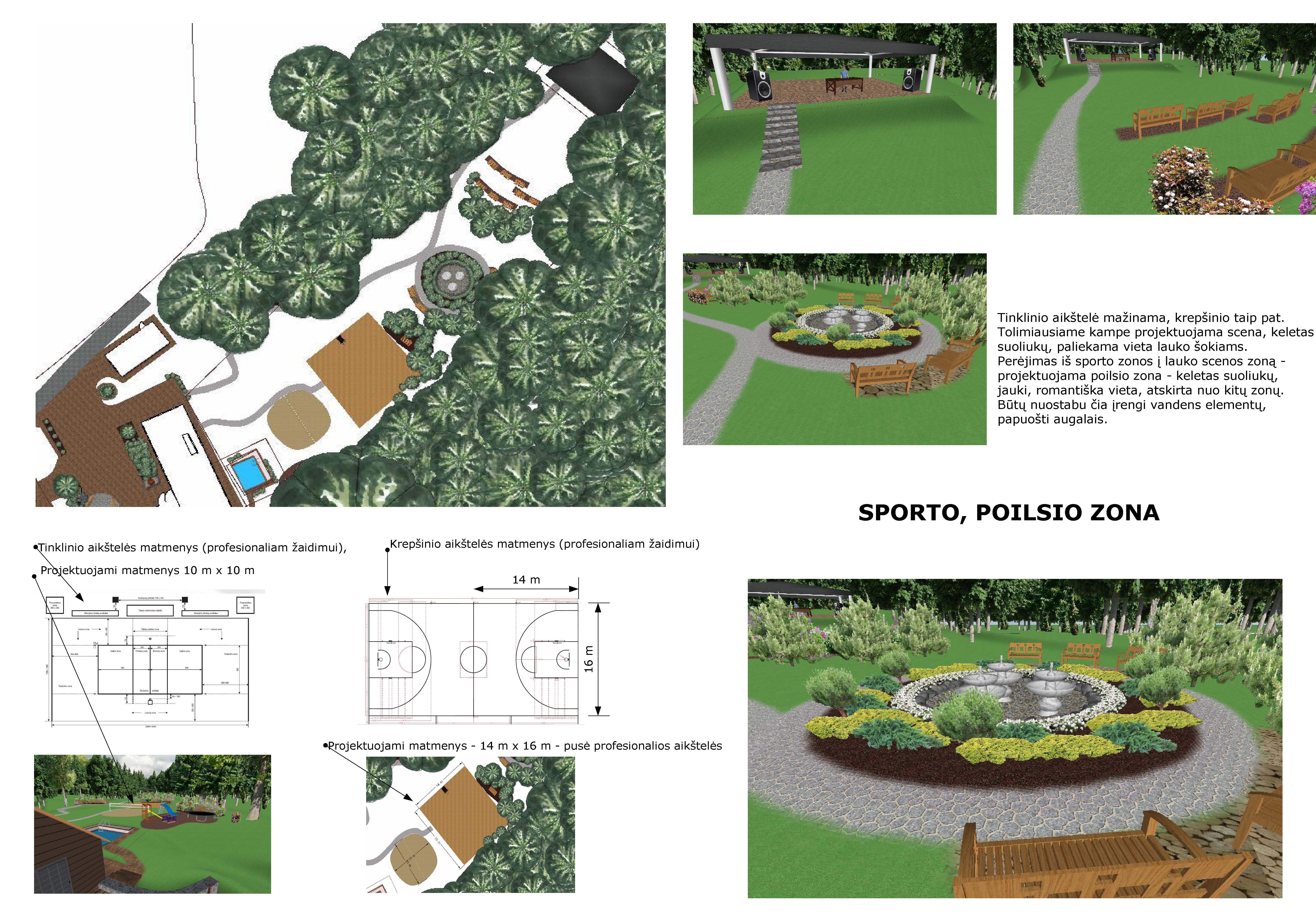 Projektavimo eiga – funkcinis zonavimas.Tai pirmas žingsnis planuojant aplinkos funkcionalumą. Svarbiausias zonavimo aspektas – pasaulio šalių išdėstymas, kur yra šiaurė, pietūs ir kt. Reprezentacinė zona visada turi atrodyti nepriekaištinai, nes atvykus į teritoriją ji matoma pirmiausiai ir palieka pirminį įspūdį. Iš šios zonos negali matytis daržo ar sandėliuko, vaikų smėlio dėžės, ar kitų elementų. Taigi ši zona dažniausia skirta dekoratyviniams augalams. Ūkinė zona – idealiausia jeigu ją išeina numatyti šiaurinėje sklypo dalyje, kur saulės yra mažiausiai, bet dar svarbiau – kad tai būtų mažiausiai visame sklype matoma dalis. Ūkinėje zonoje numatomas ir daržas, šiltnamis. Jeigu šios zonos neišeina niekur ‘paslėpti’, tai darome augalų pagalba. Poilsio zona turi būti toliausia nuo gatvės, triukšmo, ten, kur ilsėtis būtų patogu. Geriausia kad arti būtų virtuvė, nepertoliausiai suplanuota vieta malkinei, jeigu sklype turite gražų šlaitą ar vandens telkinį, svarbu kad jie matytūsi iš poilsio zonos.